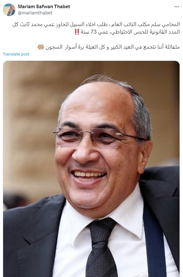 وفي وقت سابق، كشفت مريم صفوان ثابت، ابنة رجل الأعمال صفوان ثابت، عبر منشور لها كتبته على حسابها الشخصي على فيسبوك، عن الإفراج عن والدها وشقيقها سيف الدين من محبسهما.