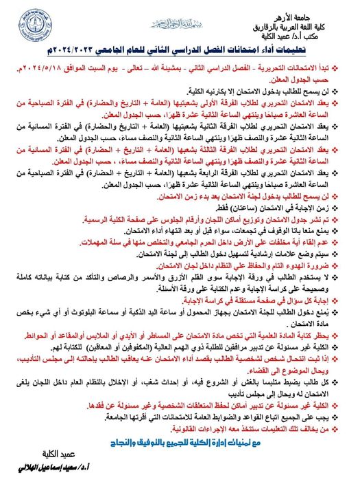 حددت كلية اللغة العربية بالزقازيق، بجامعة الأزهر، تعليمات وضوابط أداء امتحانات الفصل الدراسي الثاني للعام الجامعي 2023 / 2024.