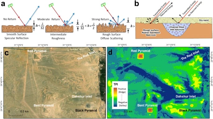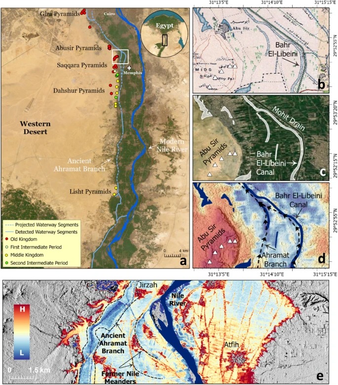 وأوضحت صور رادار الفتحة الاصطناعية SAR وبيانات ارتفاع الرادار، الدقة العالية لسهول النيل الفيضية وهوامشها الصحراوية، وتقدم أدلة على وجود أجزاء من فرع نهر قديم رئيسي على الحدود مع 31 هرمًا يرجع تاريخها إلى الفترة المتوسطة الثانية 2686− 1649 قبل الميلاد، وتمتد بين السلالات 3-13.