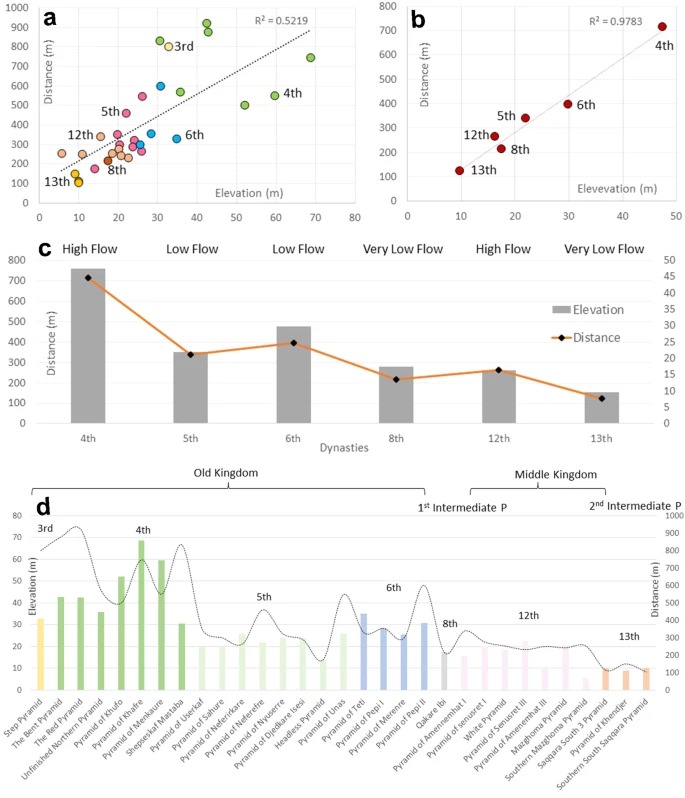 وذكرت الدراسة البحثية، أن العمل الحالي في الدراسة مكّن من اكتشاف أجزاء من فرع النيل الرئيسي السابق الذي يعمل في سفوح هضبة الصحراء الغربية، حيث تقع الغالبية العظمى من الأهرامات المصرية القديمة، مؤكدة أن ضخامة هذا الفرع وقربه من المجمعات الهرمية، بالإضافة إلى حقيقة أن جسور الأهرامات تنتهي عند ضفة النهر، كل ذلك يعني أن هذا الفرع كان نشطًا وتشغيليًا خلال مرحلة بناء هذه الأهرامات.