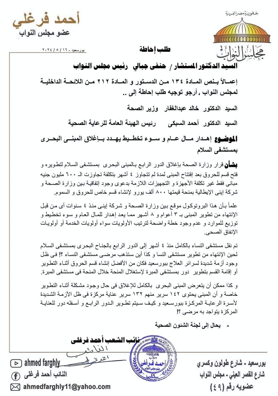 تقدم النائب أحمد فرغلي، عضو مجلس النواب، بطلب إحاطة للمستشار الدكتور حنفي جبالي رئيس مجلس النواب، موجه للدكتور خالد عبد الغفار وزير الصحة والسكان، والدكتور أحمد السبكي رئيس الهيئة العامة للرعاية الصحية، وذلك بشأن إهدار مال عام وسوء تخطيط يهدد بإغلاق المبنى البحري بمستشفى السلام.