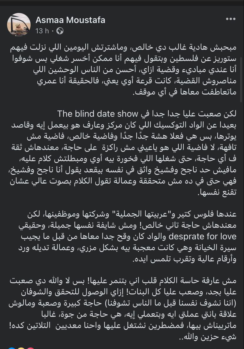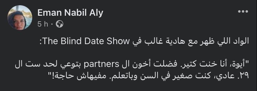 وكتبت صاحبة حساب عبر موقع التواصل الاجتماعي: أنا زعلانة والله إن هادية غالب راحت الديت دا، المفروض بننزل ديت نتعرف ونشوف لو في بينا توافق، مبنروحش نقيم الناس، ولا نحكم عليهم، ولا نحطهم في قوالب ولا نتطاول عليهم، متوافق تمام، مش متوافق خلاص فرصة سعيدة، الواد من أول الفيديو بيتعمد ترويج ثقتها في نفسه وبيقلل منها، بيقولها إنتي بيبي.. لسه ماتعرفيش حاجة، مش عارفة إنتي عايزة إيه.. انتي طفلة، وبيتريق عليها وهي بتحكي عن نفسها وشغلها وقاصد يحسسها إنها تافهة.