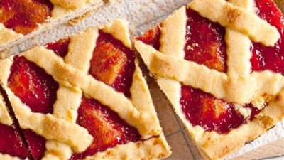- نخرج الجزء الثاني من عجينة الباستا فلورا من الثلاجة، ونقسهما إلى أجزاء صغيرة متساوية، لنضعها فوق المربى مباشرة.