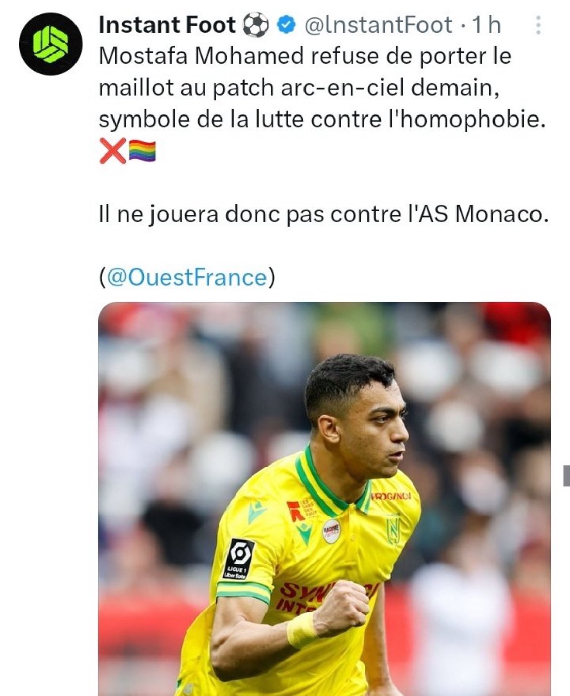 وقالت صحفية فوت ميركاتو الفرنسية، إن المهاجم المصري مصطفى محمد رفض السفر مع بعثة نادي نانت إلى موناكو لخوض المباراة لأنه الجولة الأخيرة بـ ليج 1 ستدعم المثليين.