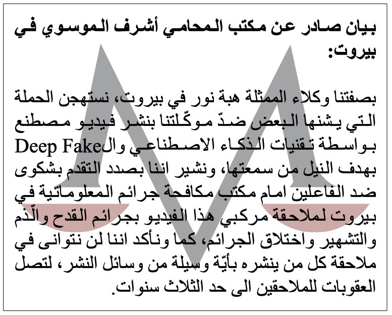 وردت هبة نور، على كل الاتهامات من خلال إصدار محاميها بيانا بخصوص هذا الفيديو ولقد جاء في البيان كالتالي:-بصفتنا وكلاء الممثلة هبة نور في بيروت، نستهجن الحملة التي يشنها البعض ضد موكلتنا بنشر فيديو مصطنع بواسطة تقنيات الذكاء الاصطناعي والـ Deep Fake بهدف النيل من سمعتها، ونشير أننا بصدد التقدم بشكوى ضد الفاعلين أمام مكتب مكافحة جرائم المعلوماتية في بيروت لملاحقة مركبي هذا الفيديو بجرائم القدح والذم والتشهير واختلاق الجرائم.