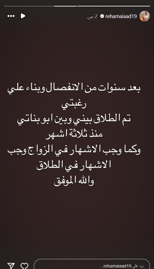 وكتبت ريهام عياد عبر ستوري حسابها بموقع إنستجرام: بعد سنوات من الانفصال وبناءً على رغبتي تم الطلاق بيني وبين أبو البنات منذ ثلاثة أشهر، وكما وجب الإشهار في الزواج، وجب الإشهار في الطلاق.