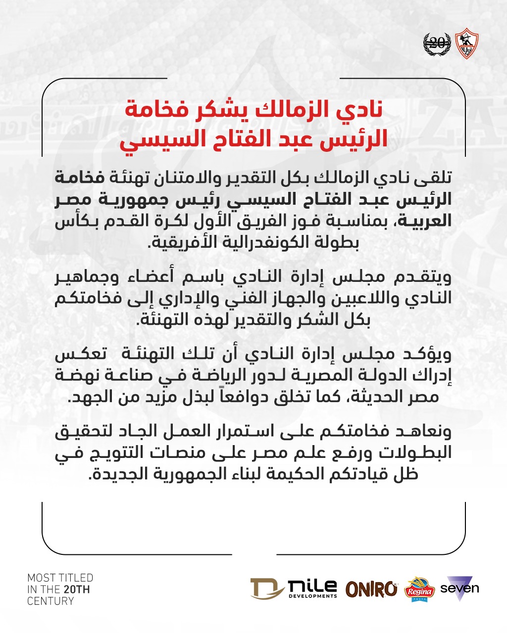 أصدر نادي الزمالك بيانًا أكد فيه أنه تلقى بكل التقدير والامتنان تهنئة الرئيس عبد الفتاح السيسي رئيس الجمهورية، بمناسبة فوز الفريق الأول لكره القدم بكأس بطولة الكونفدرالية الأفريقية.