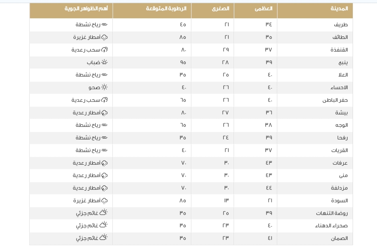 وبين المركز توقعاته لـ درجات الحرارة في السعودية اليوم والرطوبة بالنسبة المئوية وأبرز الظواهر الجوية كالتالي: