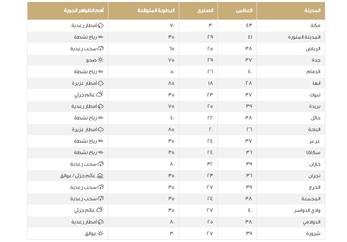 وتكثر الأمطار مصحوبة برياح نشطة وزخات من البرد على أجزاء من مناطق جازان، عسير، الباحة ومكة المكرمة في حين تكون خفيفة إلى متوسطة على أجزاء من مناطق المدينة المنورة، القصيم والرياض.
