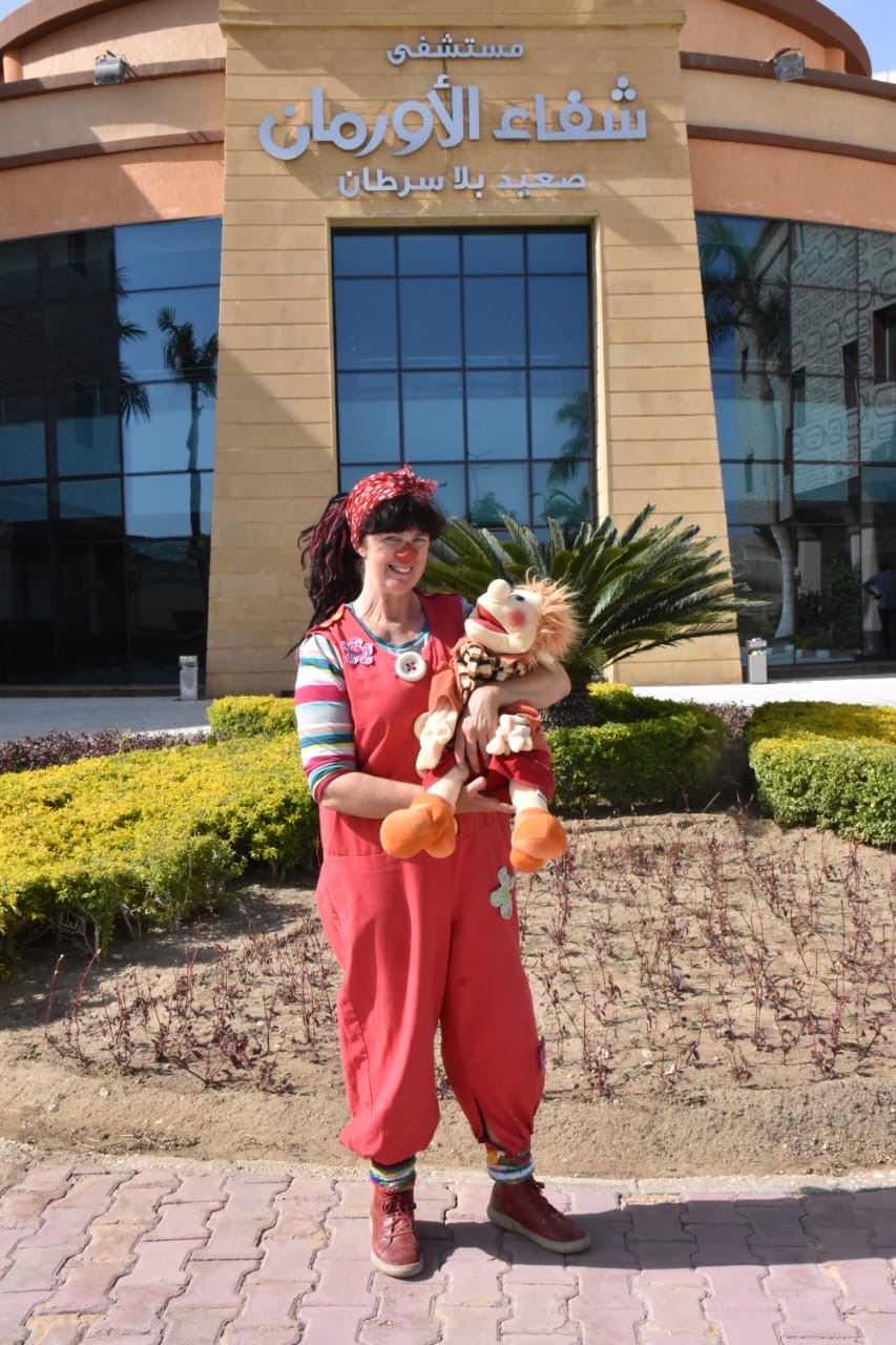 سائحة بلجيكية ترتدي زي بهلوان لإدخال البهجة على مرضى السرطان بالأقصر