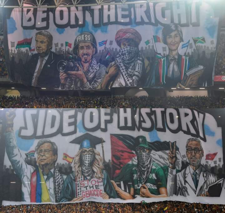 أما آخر البانرات الداعمة لأهل غزة من جانب جمهور الترجي، فكانت اللافتة التي ثبتها المشجعون في الملعب، والتي كُتب عليها عبارة نحن نقف مع فلسطين، في إشارة للدعم الصريح للقضية.