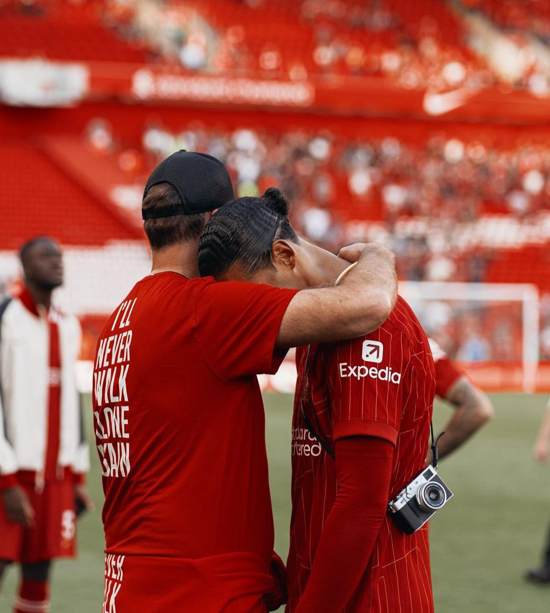 ولم يستطع فان دايك أن يمسك دموعه التي انهمرت أثناء عناق يورجن كلوب الأخير له بعد انتهاء المباراة الأخيرة له رفقة فريق ليفربول، في ظل تأثر العديد من اللاعبين الآخرين، وكان أبرزهم أرنولد ومحمد صلاح الذي ودعه المدرب الألماني بعناقه أيضًا.