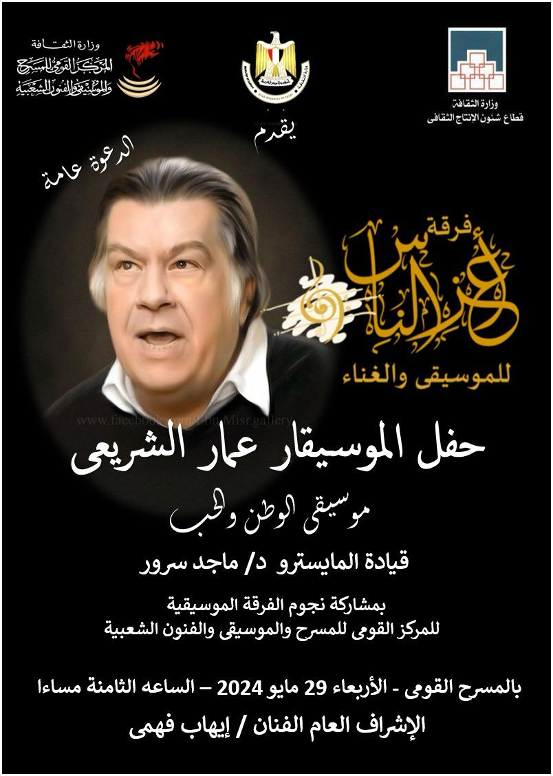 ينظم المركز القومي للمسرح والموسيقى والفنون الشعبية برئاسة الفنان إيهاب فهمي؛ حفلا موسيقيا غنائيا لتكريم اسم الموسيقار الكبير الراحل عمار الشريعي؛ بحضور رموز ونجوم الموسيقى المصرية، وذلك في الثامنة مساء الأربعاء الموافق 29 مايو 2024، بالمسرح القومي.