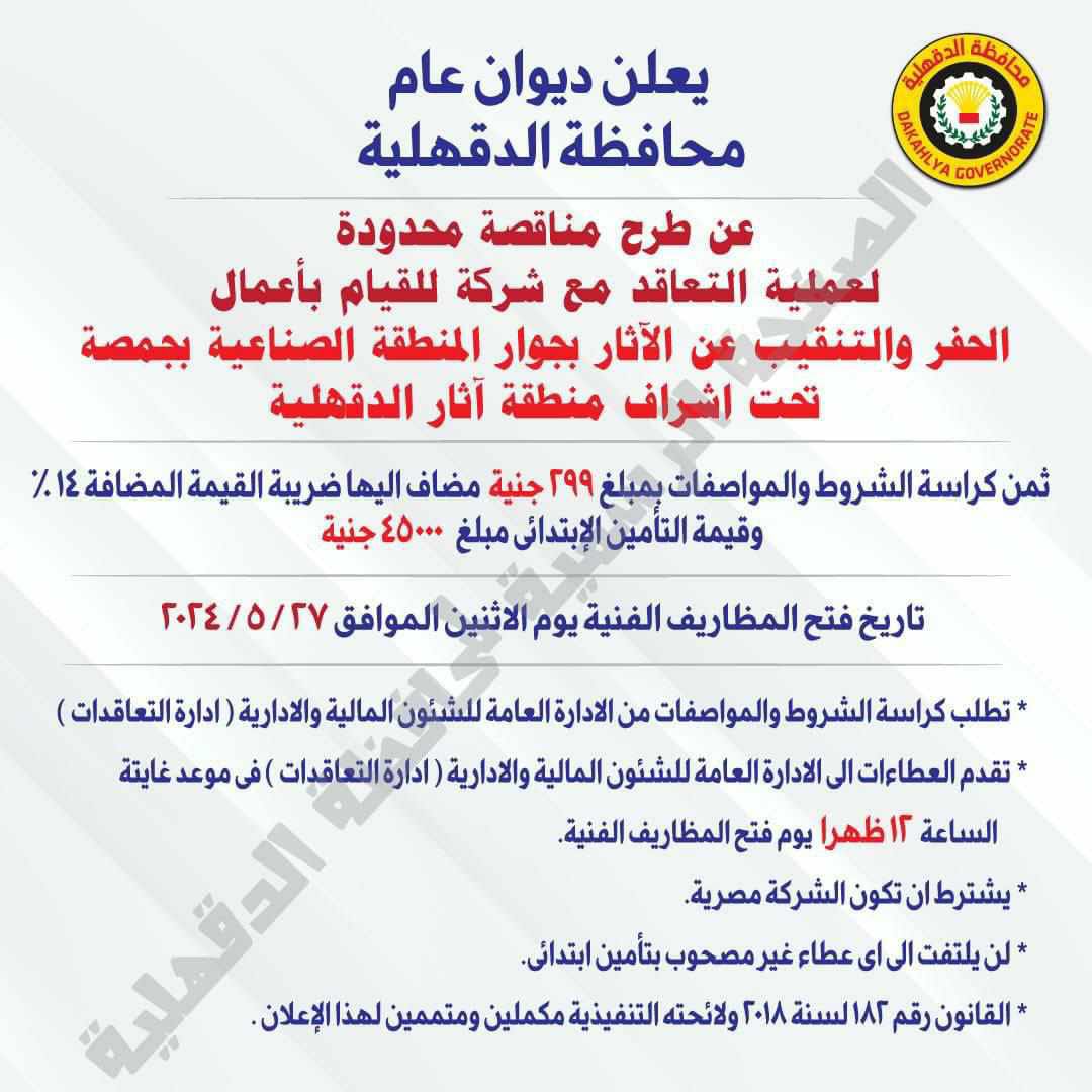 أعلنت محافظة الدقهلية، أمس الاثنين، عبر صفحتها الرسمية، عن طرح مناقصة محدودة لعملية التعاقد مع شركة للقيام بأعمال الحفر والتنقيب عن الآثار بجوار المنطقة الصناعية بجمصة تحت إشراف منطقة آثار الدقهلية.