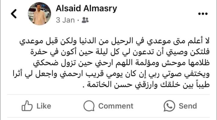 و كتب المصري علي صفحته يقول:" لا أعلم متى موعدي في الرحيل من الدنيا، ولكن قبل موعدي فلتكن وصيتي أن تدعوا لي كل ليلة، حين أكون في حفرة ظلامها موحش ومؤلمة، اللهم ارحني حين تزول ضحكتي ويختفي صوتي، ربي إن كان يومي قريب ارحمني واجعل لي أثرا طيبًا بين خلقك، وارزقني حسن الخاتمة".