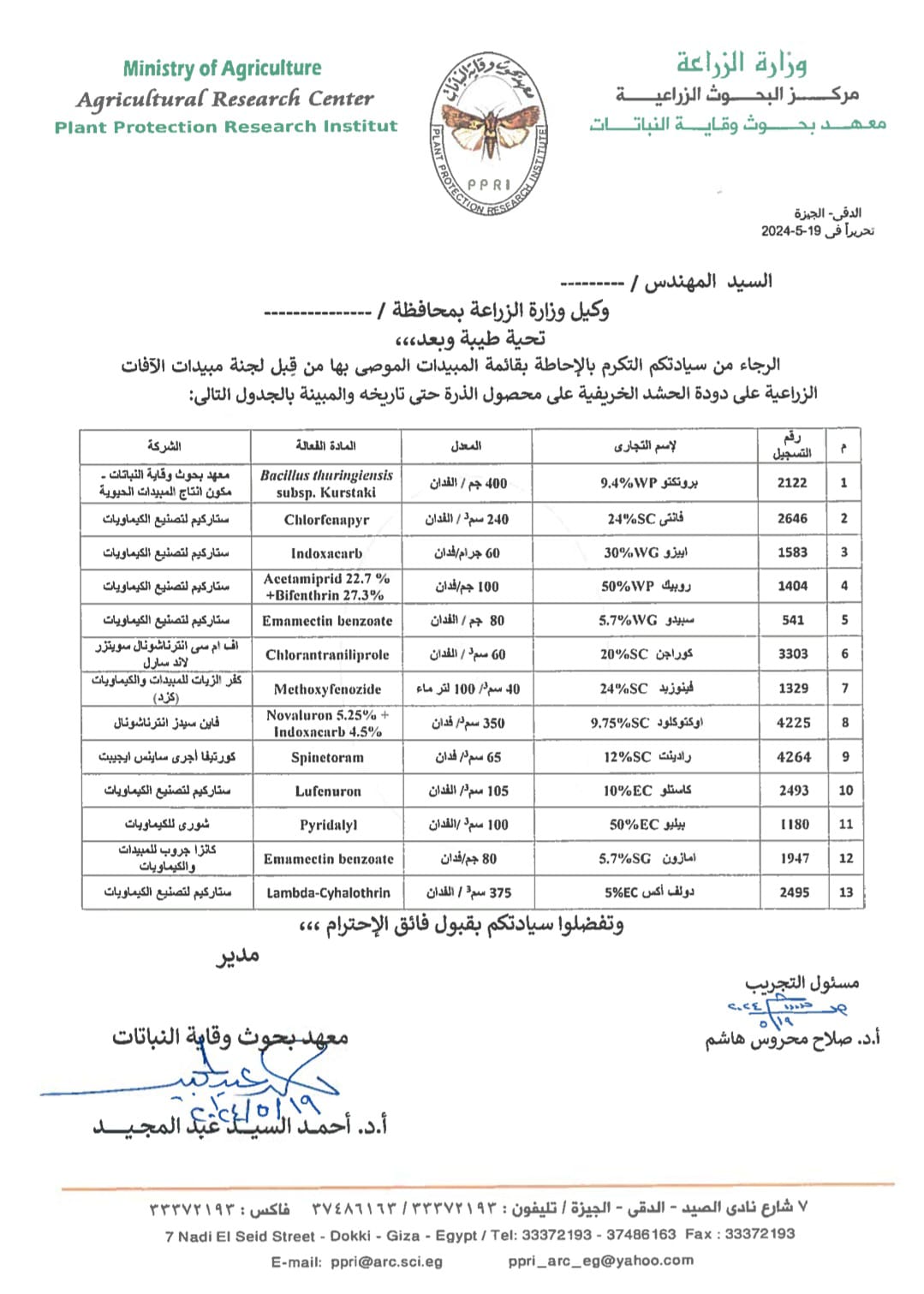 وأوضح الدكتور أحمد عبدالمجيد مدير المعهد، أن التوصيات الجديدة لمكافحة دودة الحشد على الذرة تتضمن التوعية بالمبيدات الموصي بها والمعتمدة من قِبل لجنة مبيدات الآفات الزراعية برئاسة الدكتور محمد عبدالمجيد، وهي بروتكتو 9.4%WP بمعدل 400 جم / الفدان، فانتى 24%SC بمعدل 240 سم3 / الفدان، اييزو 30%WG بمعدل 60 جرام/فدان، روبيك 50%WP بمعدل 100 جم/فدان، سبيدو 5.7% WGبمعدل 80 جم / الفدان، كوراجن 20%SC بمعدل 60 سم3 / الفدان، فينوزيد 24%SC بمعدل 40 سم3/ 100 لتر ماء، اوكتوكلود 9.75%SC بمعدل 350 سم3/ فدان، رادينت 12%SC بمعدل 65 سم3/ فدان، كاستلو 10%EC بمعدل 105 سم3/ الفدان، بيليو 50%EC بمعدل 100 سم3 /الفدان، امازون 5.7%SG بمعدل 80 جم/فدان، ودولف أكس 5%EC بمعدل 375 سم3 / الفدان