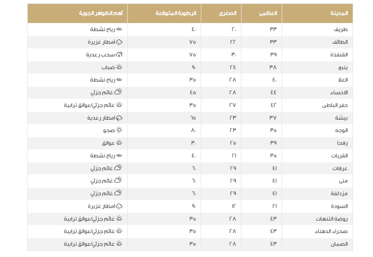 ووفقا للمركز، فإن درجات الحرارة في السعودية اليوم ونسب الرطوبة وأهم الظواهر المتوقعة تكون كالتالي: