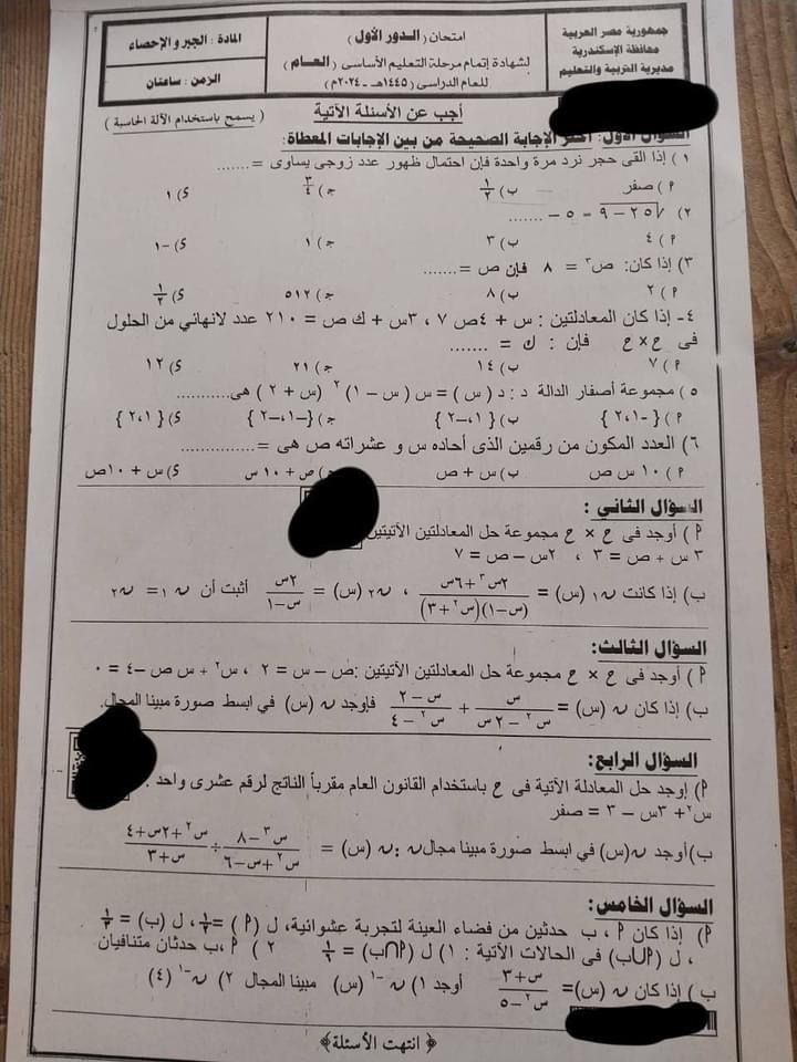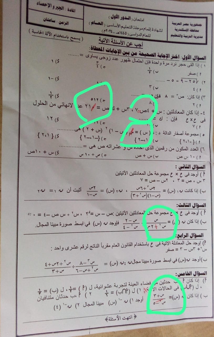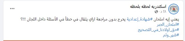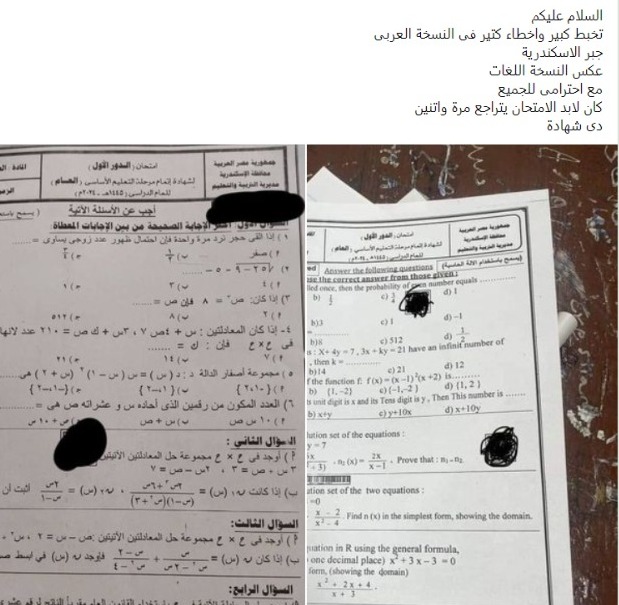 واشتكى العديد من أولياء أمور طلاب الشهادة الإعدادية بمحافظة الإسكندرية، من امتحان الجبر والإحصاء، حيث عبر أولياء الأمور عن استيائهم من الامتحان عبر جروب أولياء الأمور في التعليم، بشأن تواجد العديد من الأخطاء في أسئلة امتحان الجبر.