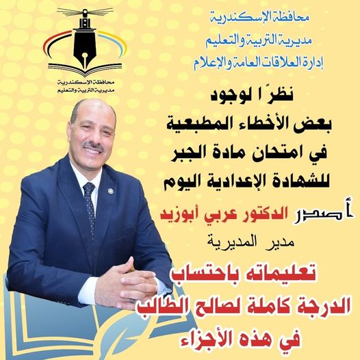 وجه الدكتور عربي أبو زيد، مدير مديرية التربية والتعليم والتعليم الفني في الإسكندرية، بضرورة إعطاء الدرجة كاملة لطلاب الشهادة الإعدادية، في الأسئلة التى وردت بها أخطاء في امتحان اليوم بمادة الجبر، مشيرًا إلى أن تلك الأخطاء مطبيعة.
