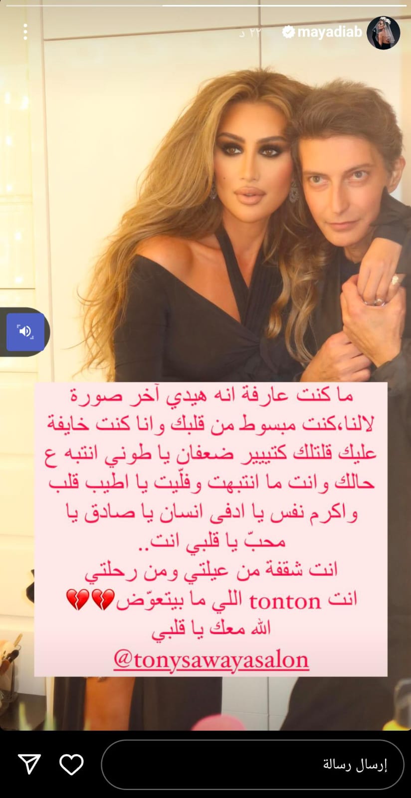 ونشرت مايا دياب، آخر صورة جمعتها مع مصفف شعر المشاهير اللبناني طوني صوايا، عبر خاصية ستوري على حسابها الشخصي بموقع إنستجرام، وعلقت قائلة: ما كنت عارفة أنه هيدي آخر صورة لنا، كنت مبسوطة من قلبك وأنا كنت خايفة عليك قلتلك كتير.