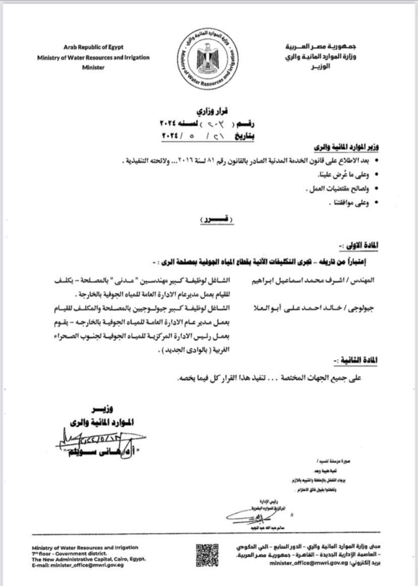 - المهندس: أشرف محمد إسماعيل إبراهيم الشاغل لوظيفة كبير مهندسين مدني بالمصلحة - يكلف للقيام بعمل مدير عام الإدارة العامة للمياه الجوفية بالخارجة، والشاغل لوظيفة كبير جيولوجيين بالمصلحة والمكلف للقيام.