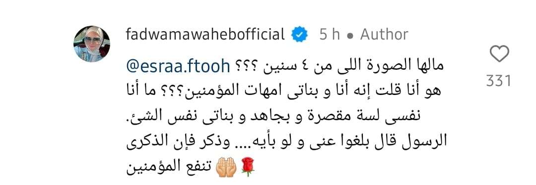وكتبت فدوى مواهب، منشورًا عبر حسابها الشخصي بموقع إكس، تويتر سابقًا، جاء فيه: مالها الصورة من 4 سنين، هو أنا قُلت إنه أنا وبناتي أمهات المؤمنين، ما أنا نفسي لسة مقصرة وبجاهد وبناتي نفس الشيء، الرسول قال بلغوا عني ولو بآية، وذكر فإن الذكرى تنفع المؤمنين.