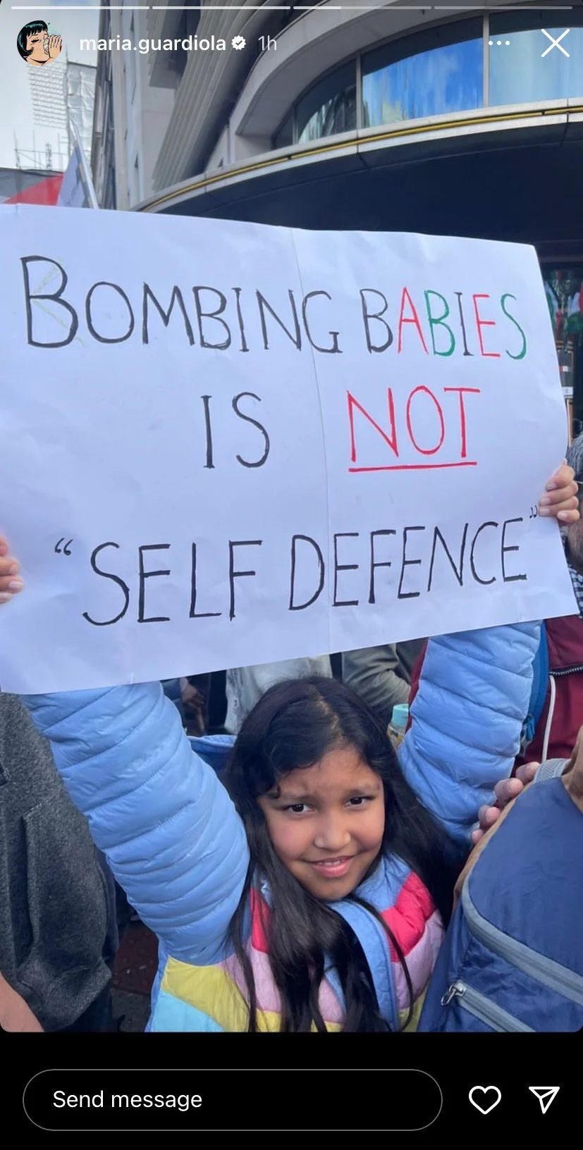 وكان من أبرز هذا الدعم التي أظهرته ابنة المدير الفني لمانشستر سيتي، الصورة التي نشرتها بعد أيام من الحرب على غزة والتي تظهر بها طفلة فلسطينية تنتظر قصف منزلها وتحمل لافتة مكتوب عليها: قتل الأطفال ليس دفاعًا عن النفس.