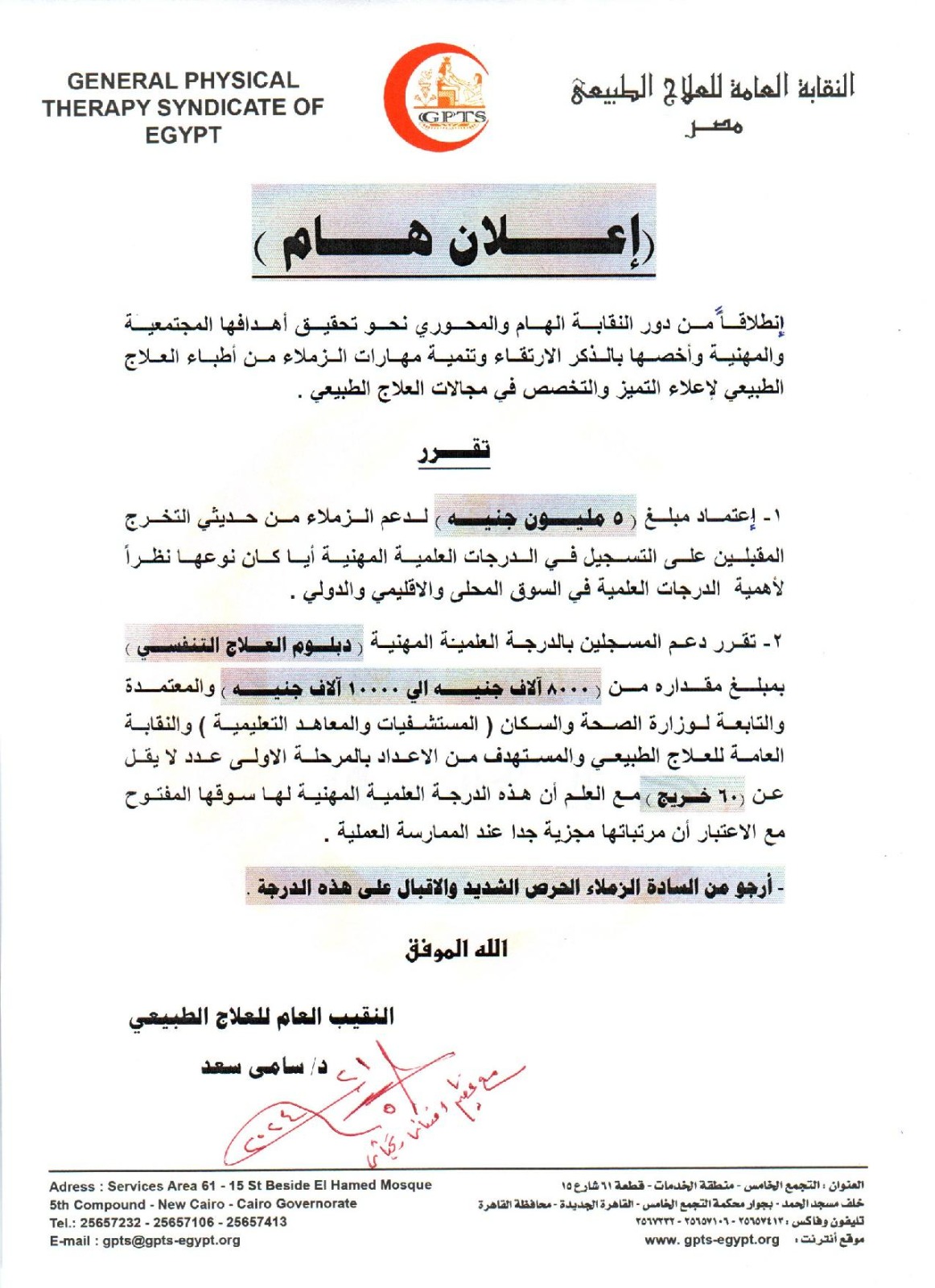 وأفاد خطاب نقابة العلاج الطبيعي، أنه تلاحظ في الآونة الأخيرة، مجموعة من الأدعياء والدخلاء على المهنة من خريجي التربية الرياضية، يسمون أنفسهم اللجنة النقابية العمالية للإصابات والعلاج الحركي، وصدر منهم العديد من المخالفات الجسيمة.