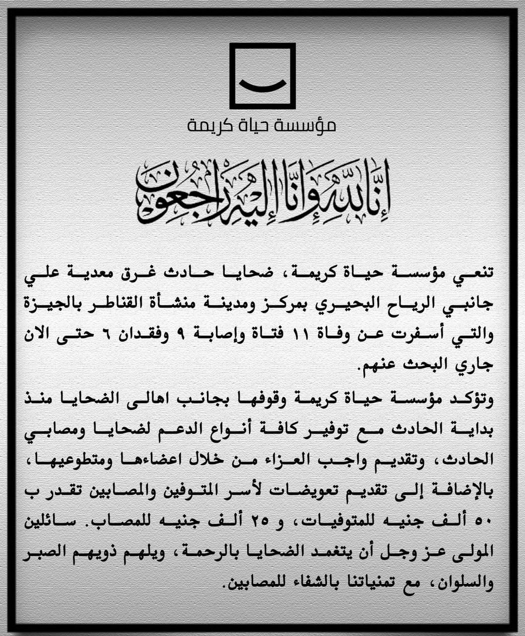 نعت مؤسسة حياة كريمة، ضحايا حادث غرق معدية على جانبي الرياح البحيري بمركز ومدينة منشأة القناطر بالجيزة، والتي أسفرت عن وفاة 11 فتاة وإصابة 9 وفقدان 6 حتى الآن جار البحث عنهم.