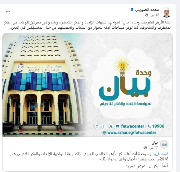 من جهته شارك فضيلة الدكتور محمد الضويني وكيل الأزهر الشريف، منشورًا لصفحة بيان الجديدة عبر صفحته بفيسبوك قائلًا: أنشأ الأزهر الشريف، وحدة "بيان" لمواجهة شبهات الإلحاد والفكر اللاديني، وبناء وعيٍ معرفيٍّ للوقاية من الفكر المتطرف والمنحرف، كما توفر مساحات آمنة للحوار مع الشباب وتحصينهم من حيل المتشكِّكين في الدين.