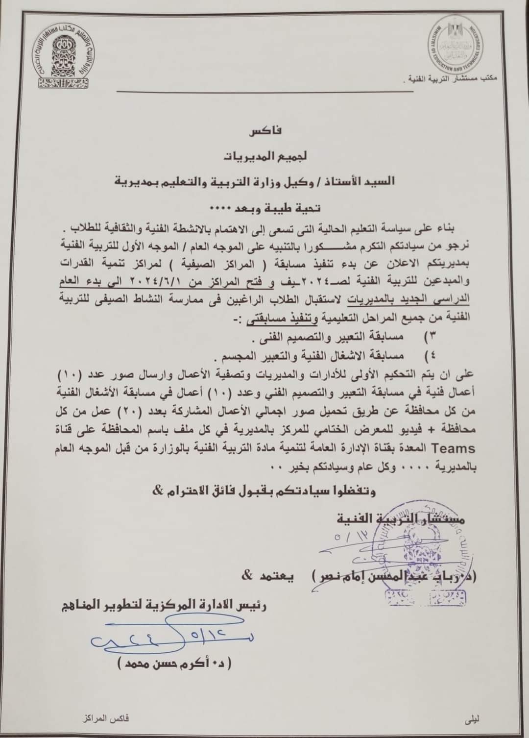 وجهت وزارة التربية والتعليم والتعليم الفني، خطابًا للمديريات التعليمية بالتنبيه على الموجه العام الأول للتربية الفنية بالمديرية بالإعلان عن بدء تنفيذ مسابقة المراكز الصيفية لمراكز تنمية القدرات والمبدعين للتربية الفنية لصيف 2024، وفتح المراكز من 1 يونيو إلى بدء العام الدراسي الجديد بالمديريات؛ لاستقبال الطلاب الراغبين في ممارسة النشاط الصيفي للتربية الفنية من جميع المراحل التعليمية وتنفيذ مسابقتي: