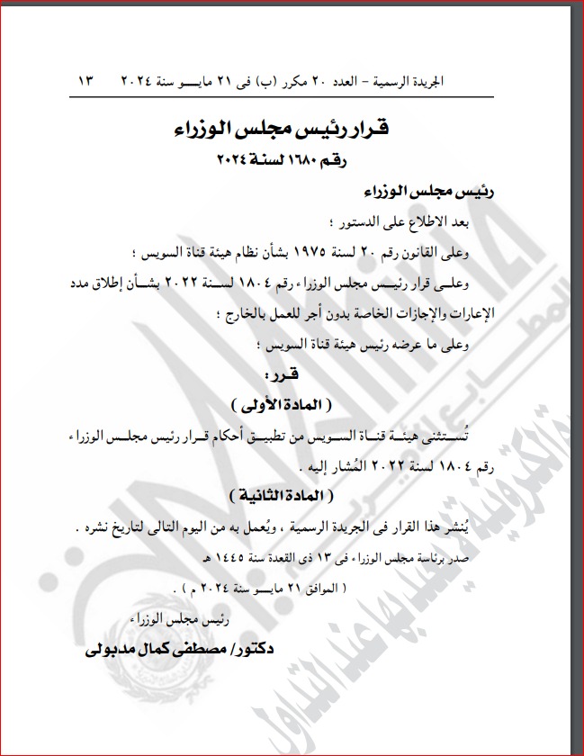 أصدر مجلس الوزراء قرارًا اليوم الأربعاء، باستثناء هيئة قناة السويس من قرار 1804 لسنة 2022 الخاص بمنح إجازات بدون مرتب للعاملين بالحكومة الذين يحصلون على إعارات أو إجازات للسفر.