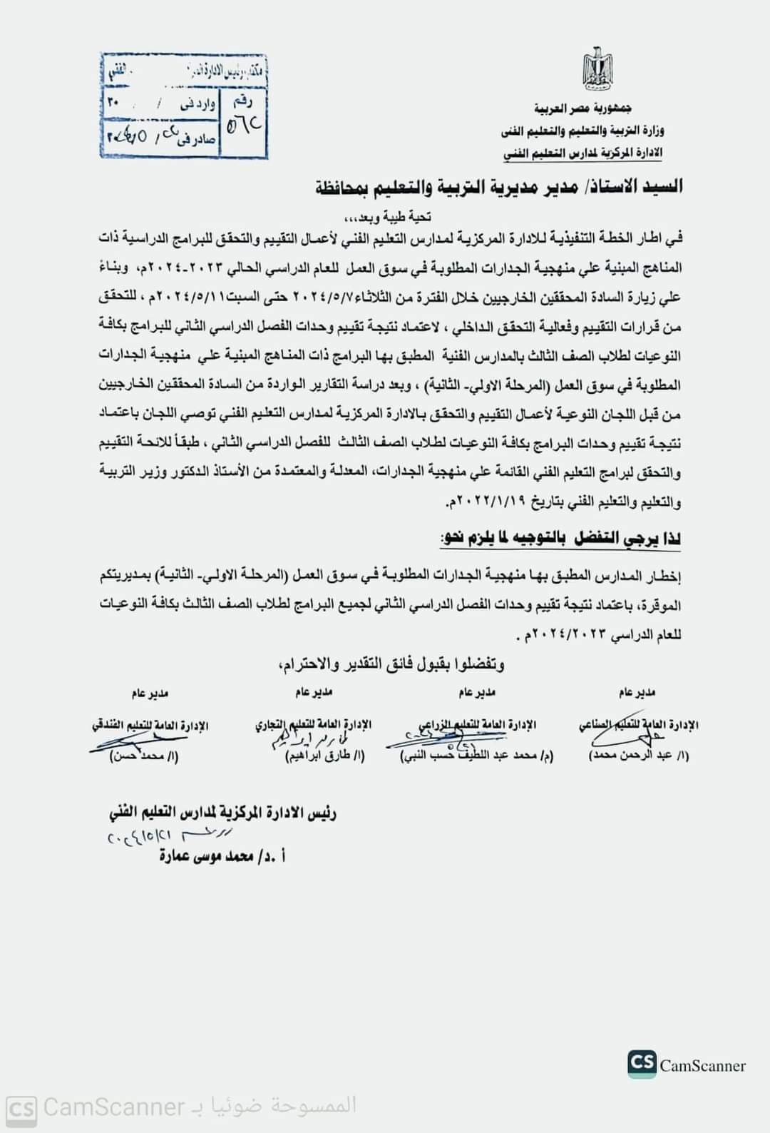 ووجهت الإدارة المركزية لمدارس التعليم الفني، خطاب للمديريات، مؤكدًة على أنه في إطار الخطة التنفيذية للإدارة المركزية لمدارس التعليم الفني لأعمال التقييم والتحقق للبرامج الدراسية ذات المناهج المبنية على منهجية الجدارات المطلوبة في سوق العمل للعام الدراسي الحالي 2023-2024م، وبناء على زيارة المحققين الخارجيين خلال الفترة من الثلاثاء 2024/5/7 حتى السبت 2024/5/11، للتحقق من قرارات التقييم وفعالية التحقق الداخلي، لاعتماد نتيجة تقييم وحدات الفصل الدراسي الثاني للبرامج بكافة النوعيات الطلاب الصف الثالث بالمدارس الفنية المطبق بها البرامج ذات المناهج المبنية على منهجية الجدارات المطلوبة في سوق العمل المرحلة الأولي الثانية.