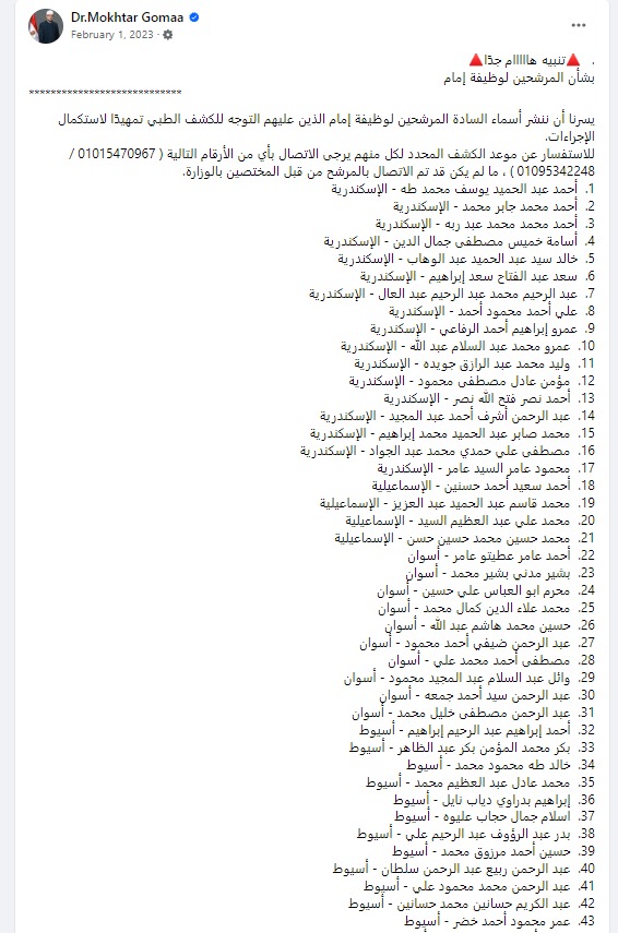 أما في مطلع فبراير 2023، قال الدكتور مختار جمعة، عبر فيس بوك: تنبيه هااااام جدًا بشأن المرشحين لوظيفة إمام، يسرنا أن ننشر أسماء السادة المرشحين لوظيفة إمام الذين عليهم التوجه للكشف الطبي تمهيدًا لاستكمال الإجراءات.