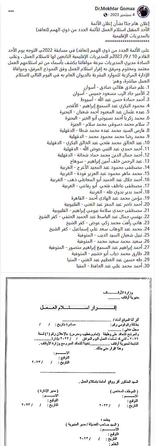 وفي 19 أكتوبر 2023، كتب وزير الأوقاف، عبر صفحته على فيس بوك: الأحد المقبل، استلام العمل للأئمة الجدد بالمديريات الإقيليمة.