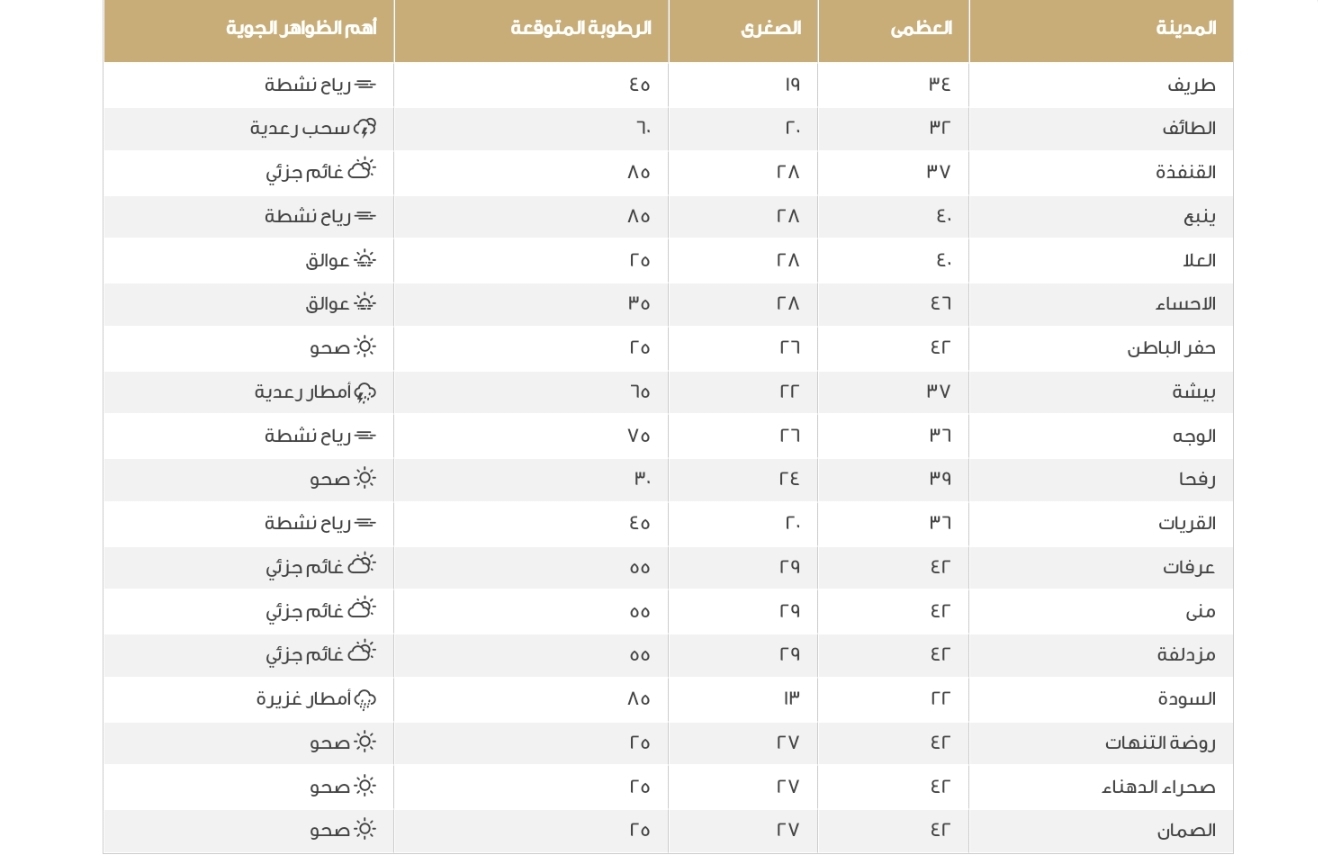 وفيما يلي درجات الحرارة في السعودية اليوم ونسب الرطوبة وأهم الظواهر الجوية: