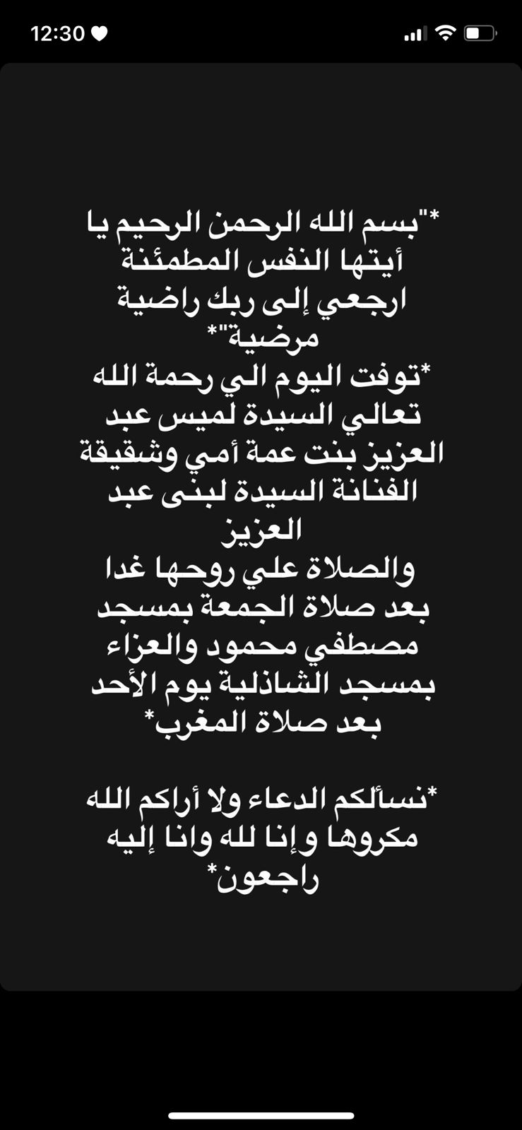 وعن موعد العزاء، أضافت نوران أبو طالب: العزاء بمسجد الشاذلية يوم الأحد بعد صلاة المغرب، نسألكم الدعاء ولا أراكم الله مكروها وإنا لله وإنا إليه راجعون.