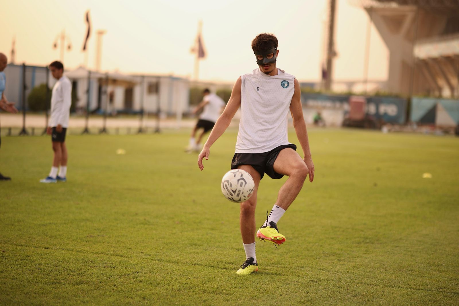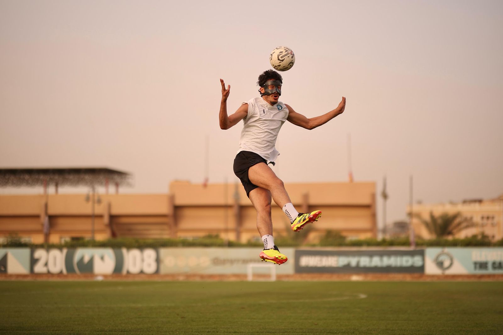 ارتدى أسامة جلال مدافع نادي بيراميدز، قناعا طبيا خلال مشاركته في تدريبات الفريق لوقايته بعد الجراحة التي أجراها مؤخرا.