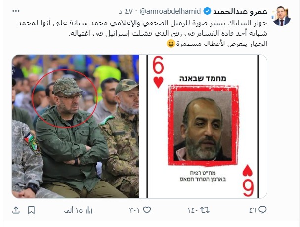 تداول رواد مواقع التواصل الاجتماعي خلال الساعات الماضية، خطأ جسيما لـ جيش الاحتلال الإسرائيلي، إذ إن الشاباك جهاز الأمن العام الإسرائيلي، نشر صورة للزميل الصحفي والإعلامي والناقد الرياضي محمد شبانة، على أنها لمحمد شبانة أحد قادة القسام في رفح، الذي فشلت إسرائيل في اغتياله.