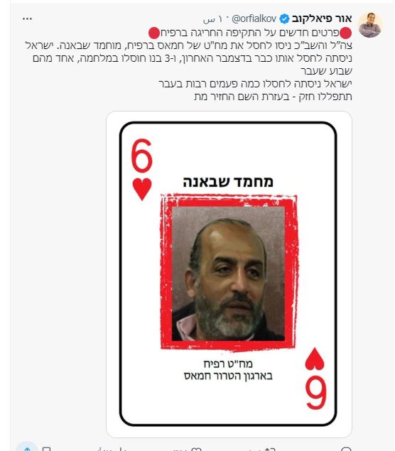 وتأكيد على منشور الإعلامي المصري، نشر فيالكوف الباحث في الحروب الإسرائيلية والإرهاب، الصورة الخطأ لـ الصحفي والإعلامي محمد شبانة، على أنها لمحمد شبانة أحد قادة القسام في رفح، الذي فشلت إسرائيل في اغتياله.
