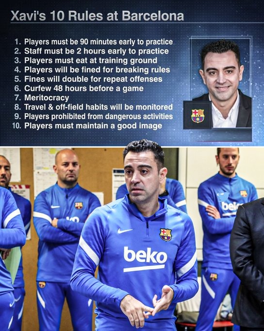 وذكر موقع ESPN الوصايا العشر لـ تشافي مع لاعبيه والجهاز الفني، حتى يكون برشلونة بالمقام الأول خلال الموسمين الماضيين.