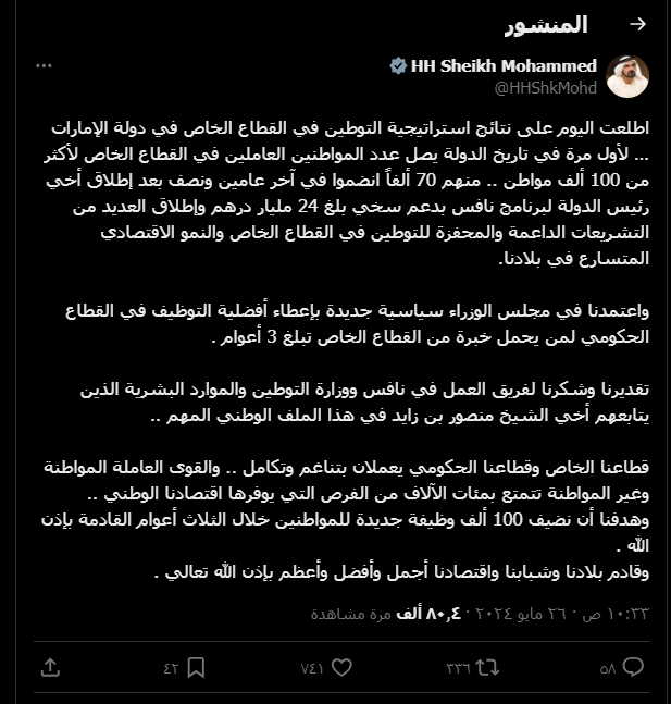 قال الشيخ محمد بن راشد نائب رئيس دولة الإمارات رئيس مجلس الوزراء، إنه لأول مرة في تاريخ الإمارات يصل عدد المواطنين العاملين في القطاع الخاص لأكثر من 100 ألف مواطن.