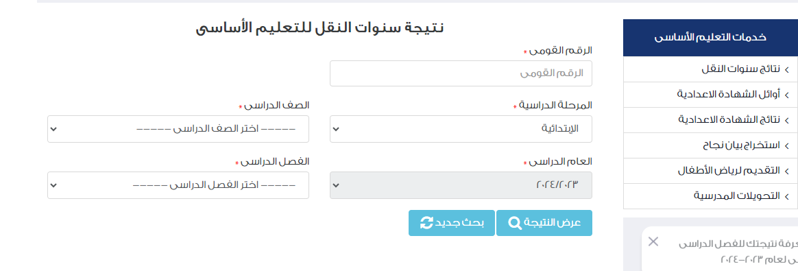 - اختيار نتيجة سنوات النقل واختيار المرحلة الابتدائية.