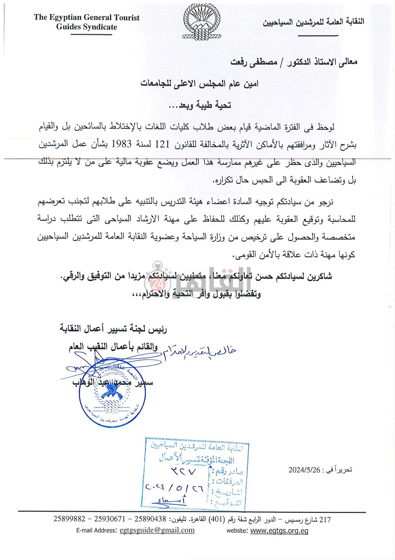 وحصل القاهرة 24 على نسخة من الخطاب المُرسل من رئيس لجنة تسيير أعمال نقابة المرشدين السياحيين، إلى الدكتور مصطفى رفعت أمين عام المجلس الأعلى للجامعات، وجاء كالتالي: