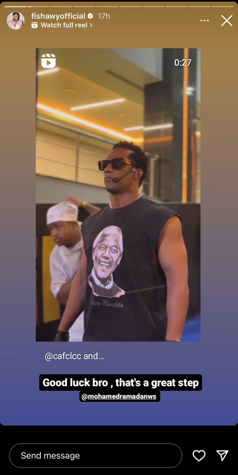 ونشر الفيشاوي، مقطع فيديو لمحمد رمضان من مشاركته بالمباراة، عبر خاصية ستورى على حسابه الشخصي بموقع انستجرام، وعلق قائلًا: حظ موفق أخي.. خطوة عظيمة.