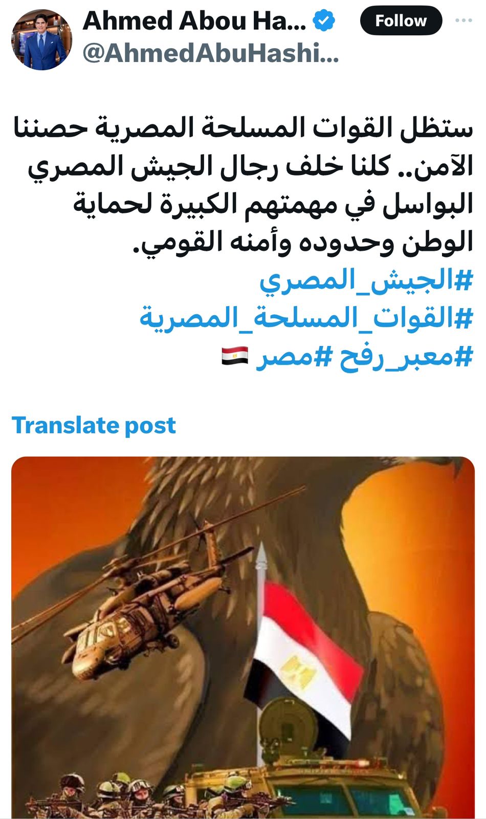 وقال أبو هشيمة في تغريدة عبر صفحته الرسمية على موقع التغريدات القصيرة X: ستظل القوات المسلحة المصرية حصننا الآمن.. كلنا خلف رجال الجيش المصري البواسل في مهمتهم الكبيرة لحماية الوطن وحدوده وأمنه القومي.