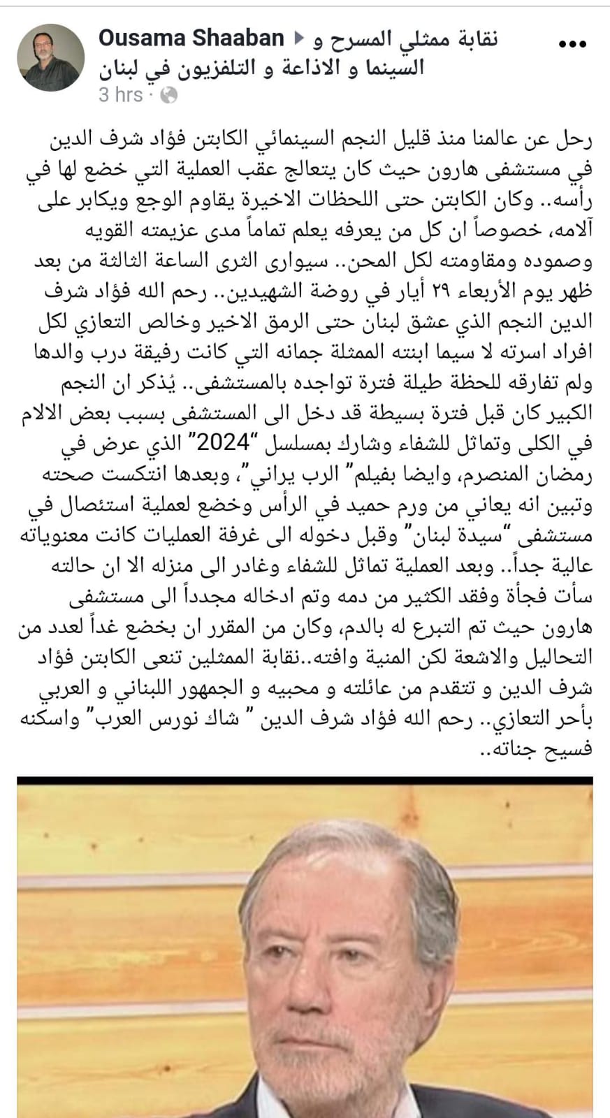 رحل عن عالمنا في الساعات الأخيرة الفنان اللبناني فؤاد شرف الدين، بعد رحلة عصيبة ومعاناة مع المرض إثر إصابته بورم في المخ، الذي خضع بعده لعملية جراحية دقيقة، لكن رحل بعد خضوعه لتلك العملية، نتيجة تدهور حالته الصحية.