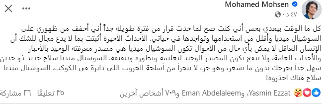 وكتب محمد محسن منشورًا، عبر حسابه الشخصي بموقع التواصل الاجتماعي فيس بوك، قال فيه: كل ما الوقت بيعدي بحس إني كنت صح، لما خدت قرار من فترة طويلة جدًا إني أخفف من ظهوري على السوشيال ميديا، وأقلل من استخدامها وتواجدها في حياتي.