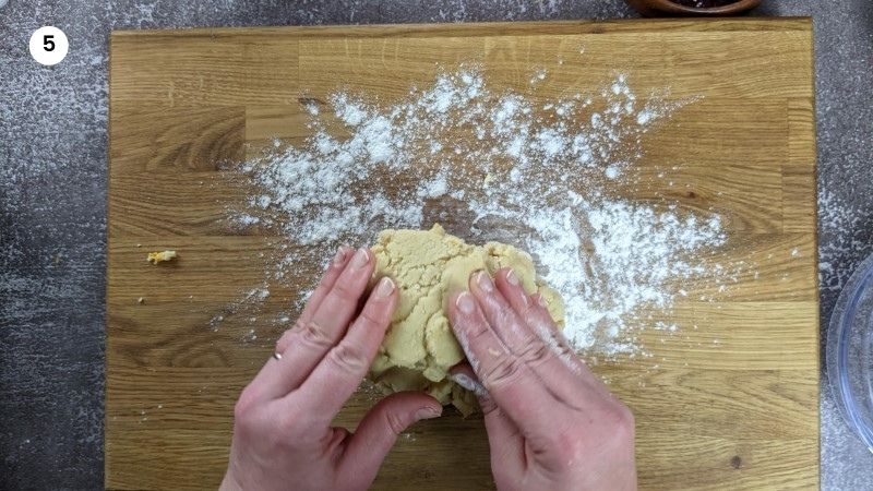- نضع المكونات الجافة على العجينة، ونقلبهما حتى يختفي الدقيق تمامًا.