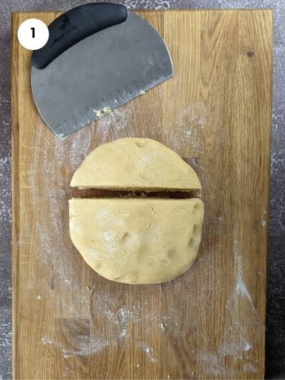 - نقسم العجينة إلى ثلث وثلثين، وندخل القطعة الصغيرة إلى الثلاجة مرة أخرى.